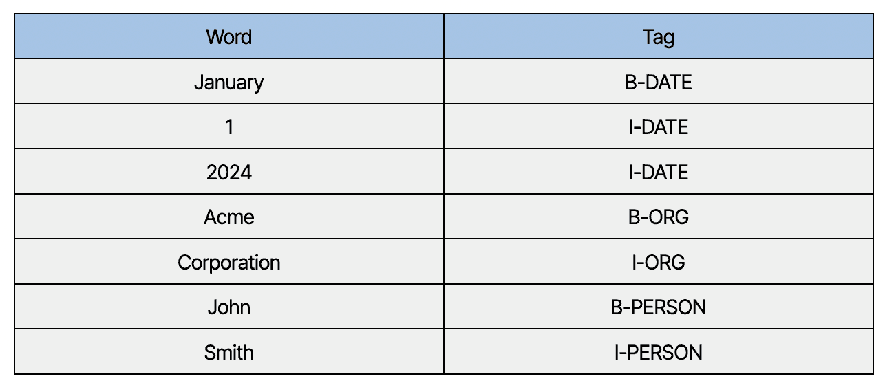 DATE: “January 1, 2024” – The beginning (B) of the date is “January,” followed by inside (I) tags for “1” and “2024.”