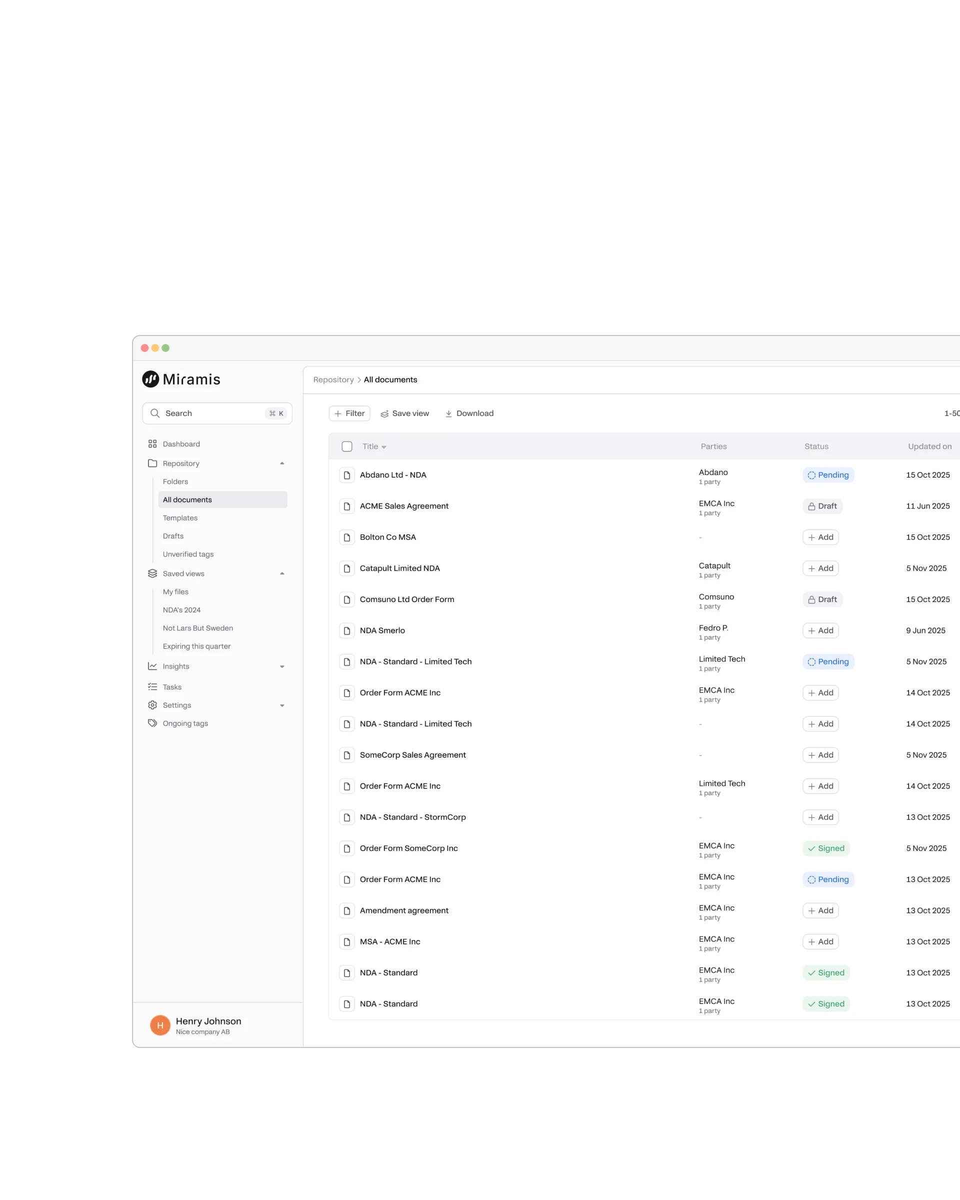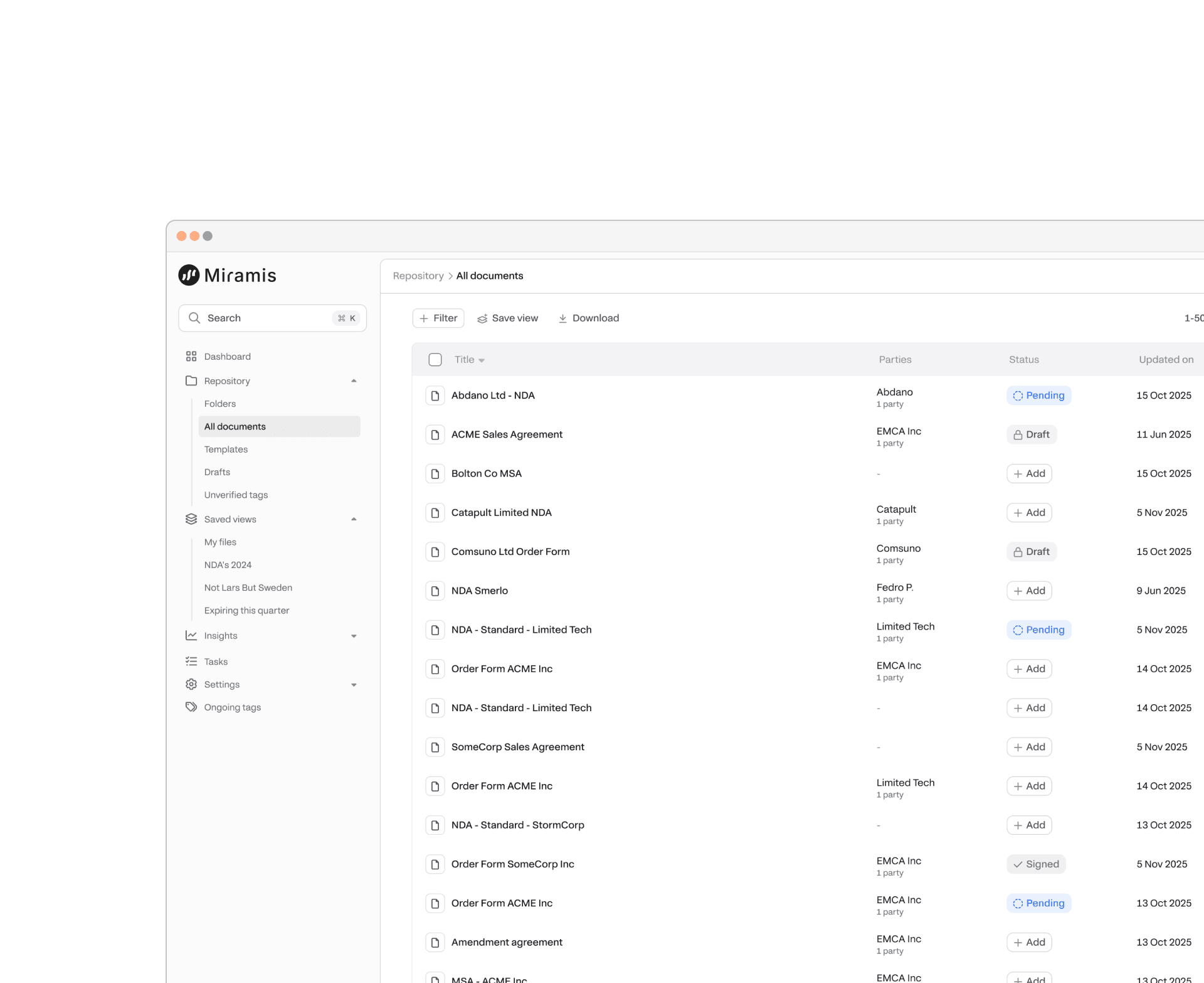 How does Miramis help organise contracts?